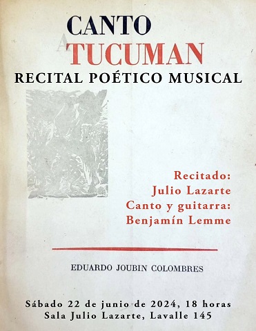 Letras de Fuego / Noticias. El ciclo de Recitales Poético Musicales en la Sala Lazarte continúa revalorizando las grandes obras de la historia cultural tucumana. Este sábado será el turno de “Canto Tucumán”, de Eduardo Joubin Colombres, en la voz del Maestro Julio Lazarte.