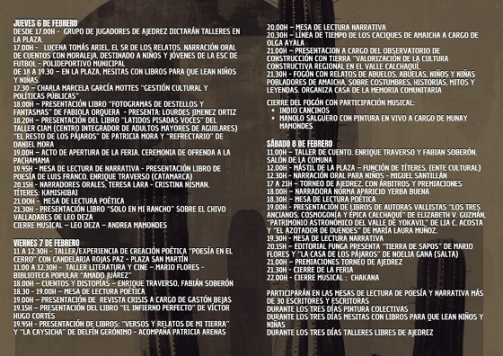 La Feria comenzará este jueves 6 de febrero, continuará el miércoles 7 y finalizará el sábado 8, con la presencia de escritores de los Valles Calchaquíes, de todo Tucumán y de diversas provincias de la región, como Catamarca, Salta y Santiago del Estero.