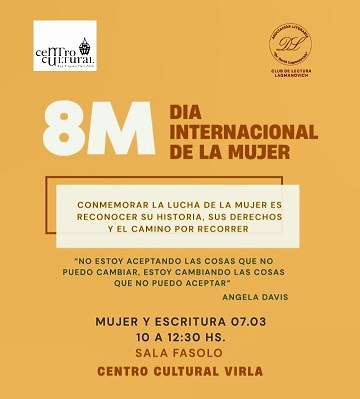 Letras de Fuego / Noticias. Desde la Asociación Lagmanovich informaron la realización de la actividad “Mujer y escritura”, en el marco de la conmemoración del Día de la Mujer. Será este sábado, de 10 a 13 en el Centro Cultural Virla.