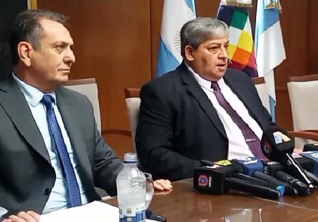 El interventor de la Caja Popular de Ahorros, Guillermo Norry, junto al subinterventor Antonio Bustamante, encabezaron una conferencia de prensa en la que confirmaron la presentación de una denuncia penal por una presunta “asociación ilícita” en torno a la millonaria demanda del exjugador de San Martín, Adrián Arregui.