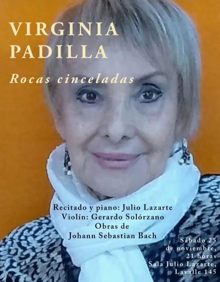 Letras de Fuego / Noticias. Este sábado 25 de noviembre, a las 21, en la Sala Julio Lazarte, se realizará un recital poético musical con poemas del libro “Rocas cinceladas”, de Virginia Padilla, en la voz del Maestro Julio Lazarte, y música de Johann Sebastian Bach.