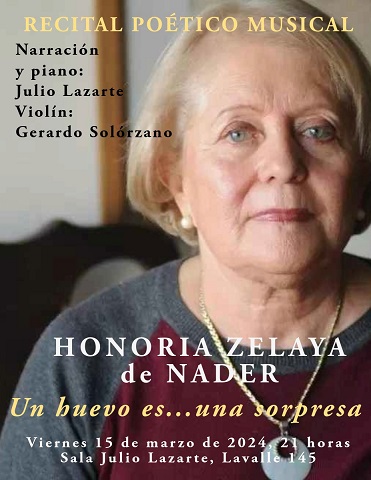 Letras de Fuego / Noticias. El ciclo de Recitales Poético Musicales proseguirá con las autoras de literatura infantil. Este viernes, a las 21, en la Sala Lazarte, será el turno del libro “Un huevo es… una sorpresa” (1985), de Honoria Zelaya de Nader, en la voz del Maestro Julio Lazarte.
