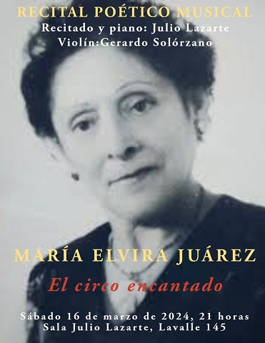 Letras de Fuego / Noticias. El ciclo de Recitales Poético Musicales proseguirá con las autoras de literatura infantil. Este sábado, a las 21, en la Sala Lazarte, será el turno del libro “El circo encantado” (1983), de María Elvira Juárez, en la voz del Maestro Julio Lazarte.