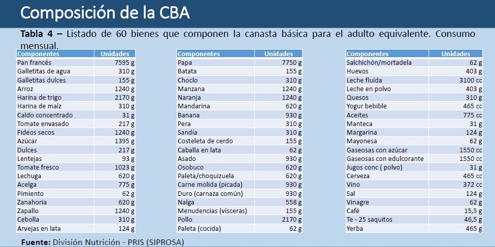La Canasta Básica Alimentaria (CBA) de Tucumán está compuesta por 60 alimentos. Se ha determinado tomando en cuenta los requerimientos normativos kilocalóricos y proteicos imprescindibles para que un varón adulto, entre 30 y 60 años, de actividad moderada, cubra durante un mes esas necesidades. Indicador empleado como un estándar de referencia.