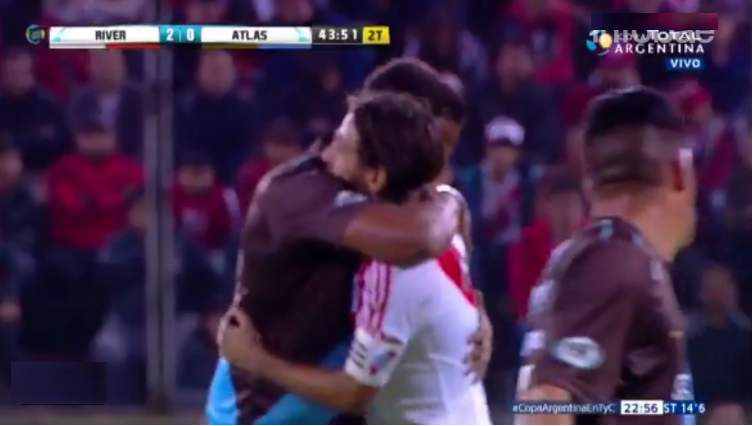 Aunque su equipo quedó eliminado (cayó por 3 a 0, debido a los dos goles de Pity Martínez y a uno de Nacho Fernández), la noche fue mágica y soñada para él. Ingresó a falta de cinco minutos y no pudo contener la emoción. Entre lágrimas, tras un afectuoso saludo con su entrenador, abrazó a Leonardo Ponzio en el medio del campo: “Mucho tiempo fui referente de mi equipo, y por eso entiendo a los que cumplen esa función en otros equipos. Por eso fui a abrazarlo”, esbozó el cordobés.