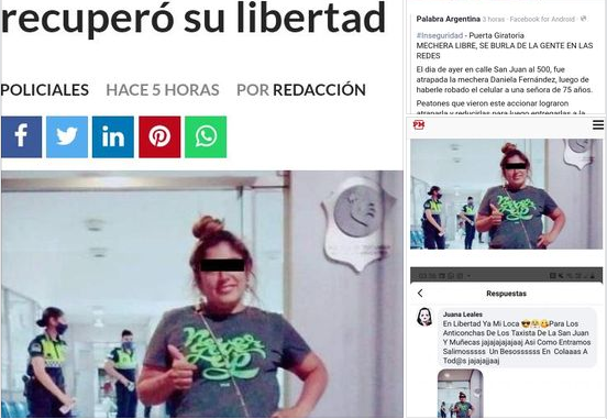 La inseguridad crece en Tucumán de la de la impunidad y la falta de justicia. Los delincuentes se mueven como “Juan por su casa” por las calles de Tucumán, y eligen tranquilos a sus presas, sabiendo que -a lo sumo-, una vez de cometido el atraco, serán atrapados, detenidos y tras algunas horas (o días a lo sumo) serán devueltos a las calles. Como el caso de la “mechera” que se burló por las redes sociales de sus víctimas y captores la semana pasada. Es que, luego de robarle a una anciana, un grupo de transeúntes logró atraparla y entregarla a la policía. Sin embargo, a las pocas horas la delincuente subió a las redes una foto suya siendo liberada: “Así como entramos salimos”, escribió en tono de burla en las redes.
