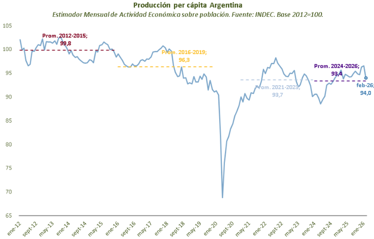 Este miércoles el INDEC informó que el Estimador Mensual de Actividad Económica (EMAE) se derrumbó 2,6% respecto de enero. De este modo, la serie desestacionalizada tocó su valor más bajo desde julio de 2025.