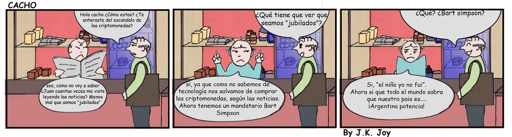 Actualidad La estafa de las criptomonedas: “Sin victimas jubiladas” 18 febrero, 2025 Compartir en Facebook Compartir en Twitter 🔊 Escuchar la entrada El personaje principal de la tira cómica de Diario Cuarto Poder , Cacho, Creado por J.K. Joy ,habla irónicamente sobre las ventajas de ser “jubilado” y las escusas del poder Comments Comentarios