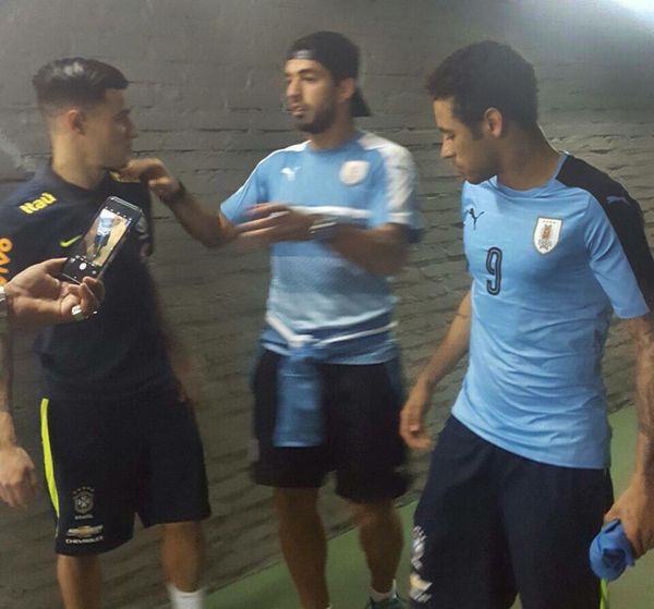 Luis Suárez, que se perdió el partido por llegar a la quinta amarilla, le obsequió su remera al delantero paulista, y se detuvo a charlar con él y con Philippe Coutinho, el futbolista de 24 años y estrella del Liverpool de Jürgen Klopp.