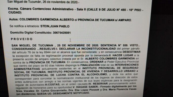 Luego de ello, el fallo hace lugar al amparo colectivo instado por el abogado Alberto Colombres Garmendia en contra de la provincia de Tucumán. En virtud de ello, se modificaría el actual estado de situación de dichos organismos.