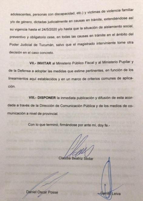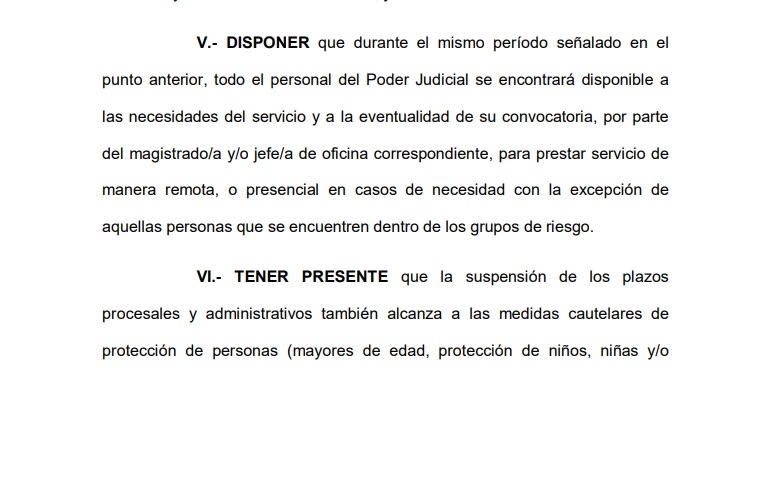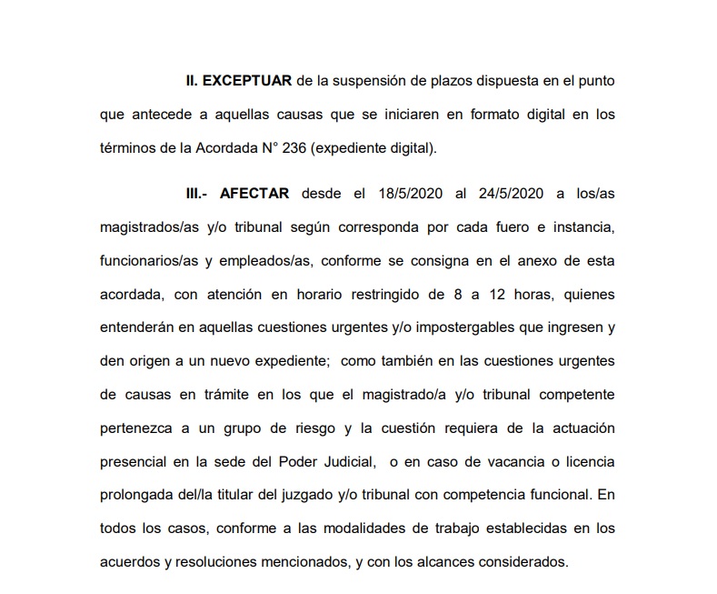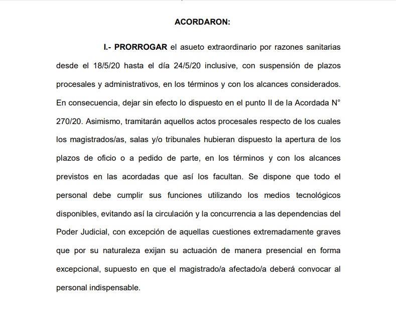 La nueva acordada, publicada en horas de esta noche, afirma que se extiende el asueto extraordinario por razones sanitarias, con la suspensión de pasos procesales y administrativos, cabe destacar que durante la cuarentena, se estrenó el uso del “expediente digital”, con el cual los letrados pudieron seguir presentando actuaciones en forma remota.