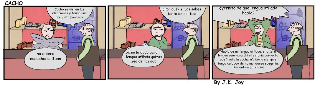 Actualidad La lengua filosa vs la venenosa¿Quién ganará? 1 octubre, 2025 Compartir en Facebook Compartir en Twitter 🔊 Escuchar la entrada El personaje principal de la tira cómica de Diario Cuarto Poder , Cacho, Creado por J.K. Joy , no quiere usar su lengua afilada para hablar de política justo en este momento, tan cerca de las elecciones. Comments Comentarios