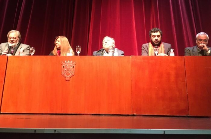 La mesa de presentación estuvo integrada por el rector de la UNSE, ingeniero Rubén Paz; el subsecretario de Cultura provincial, licenciado Juan Anselmo Leguizamón; el subsecretario de Cultura y Turismo municipal, y el arquitecto Rodolfo Legname.