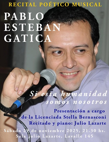- “Si esta humanidad somos nosotros”, de Pablo Esteban Gatica. A las 21.30, en la Sala Lazarte. Presentación a cargo de la licenciada Stella Bernasconi. Recitado y piano: Maestro Julio Lazarte.