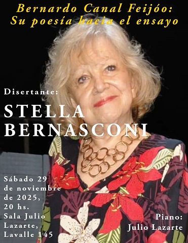 - Disertación “Bernardo Canal Feijóo: su poesía hacia el ensayo”, a cargo de Stella Bernasconi. A las 20, en la Sala Lazarte. Piano: Maestro Julio Lazarte.