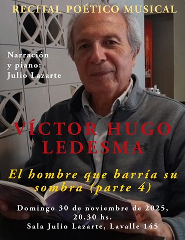 - “El hombre que barría su sombra”, de Víctor Hugo Ledesma. A las 20.30, en la Sala Lazarte. Narración y piano: Maestro Julio Lazarte.