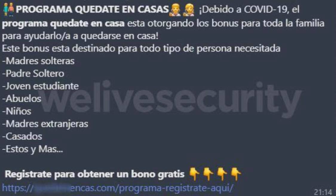 La compañía de seguridad informática ESET analizó un engaño que ha estado circulando a través de WhatsApp en el que se ofrece una supuesta ayuda en estos tiempos de coronavirus. Bajo la consigna “Quédate en casa”, las potenciales víctimas reciben un mensaje en el que se ofrece un supuesto bono como forma de ayuda, aunque sin hacer referencia a una entidad, empresa u organismo como responsable de esta iniciativa.