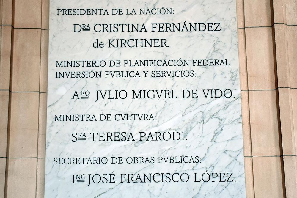 Como se ve en la foto, después del nombre de la presidente, del ministro de Planificación Federal, Inversión Pública y Servicios, arquitecto Julio Miguel De Vido, de la ministra de Cultura, señora Teresa Parodi, figura el nombre del secretario de Obras Públicas, ingeniero José Francisco López. Esa placa está ahí, a la vista de todos, y no fue removida tampoco por las actuales autoridades en un intento por no infligir heridas a los símbolos más caros al kirchnerismo.
