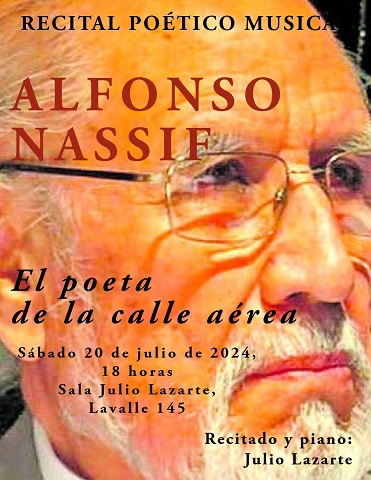Este sábado 20 de julio, desde las 18, en la Sala Lazarte, se llevará a cabo la presentación del libro “El poeta de la calle aérea”, del escritor santiagueño Alfonso Nassif, que será recitado con su magistral capacidad por el Maestro Julio Lazarte.