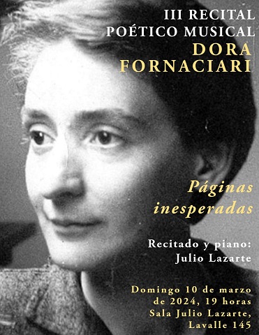 Finalmente, el domingo 10 de marzo, también tendrá continuidad la difusión de la obra de Dora Fornaciari, con el tercer recital poético sobre ella. En la oportunidad, se recitará “Páginas inesperadas”, con texto inéditos de la autora.