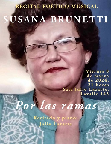 En tanto que el viernes 8 de marzo, en el mismo lugar y horario, será la presentación dedicada a la escritora Susana Brunetti, con el magnífico recitado de la obra “Por las ramas”, a cargo de Julio Lazarte.