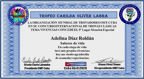 Letras de Fuego / Noticias. La poeta santiagueña Adelina Díaz Roldán fue reconocida con el 5º premio en el Concurso de Trovas Clásicas de la Organización Mundial de Trovadores Cuba por su composición titulada “Saberes de vida”.