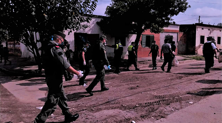 Efectivos policiales entregaron este lunes 2.500 botellas de alcohol a los vecinos del barrio Juan XXIII y zonas aledañas. “El objetivo es acompañar a la sociedad, llevarles tranquilidad y recordarles las medidas preventivas que deben respetar en este marco de aislamiento social y obligatorio”, explicó el subdirector de la Dirección General de Prevención Ciudadana, Jorge Mastafá.