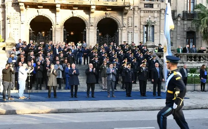 El gobernador, Juan Manzur, y el vicegobernador, Osvaldo Jaldo, tomaron juramento, este lunes por la mañana, a nuevos cadetes de policía egresados del Instituto de Enseñanza Superior de Policía General San Martín y realizaron el nombramiento de personal transitorio policial y del personal para el Servicio Penitenciario de la Provincia, en la explanada de Casa de Gobierno.