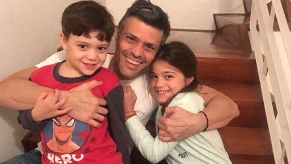 El opositor venezolano Leopoldo López, a quien se le concedió hoy la prisión domiciliaria y pudo salir de la cárcel, pudo ser retratado, por primera vez después de tres años y cinco meses, en una foto desde su casa, acompañado de sus dos hijos, Manuela y Leopoldo Santiago.