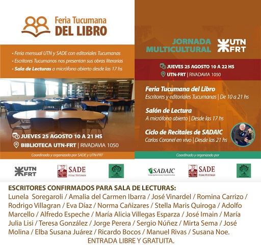 La Sociedad Argentina de Escritores (SADE) Filial Tucumán y la Facultad Regional Tucumán de la Universidad Tecnológica Nacional (UTN-FRT), llevarán a cabo, mañana de 10 a 22, otra edición de la Feria Tucumana del Libro.