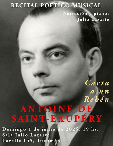 - “Carta a un Rehén”, de Antoine de Saint-Exupéry. A las 19, en la Sala Lazarte, Lavalle 145, San Miguel de Tucumán. Narración y piano: Maestro Julio Lazarte.