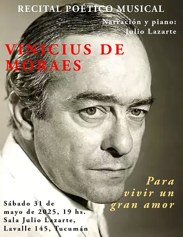 - “Para vivir un gran amor”, de Vinicius de Moraes. A las 19, en la Sala Lazarte, Lavalle 145, San Miguel de Tucumán. Narración y piano: Maestro Julio Lazarte.