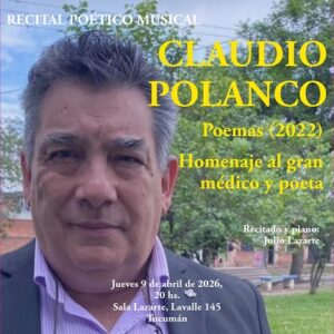 - “Poemas (2022). Homenaje al gran médico y poeta”, Claudio Polanco. A las 20 en la Sala Lazarte, de Lavalle 145, San Miguel de Tucumán. Recitado y piano: Julio Lazarte.