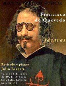 - Jueves 13 de junio: “Jácaras”, de Francisco de Quevedo, a las 18, en la Sala lazarte. Recitado y piano: Maestro Julio Lazarte.