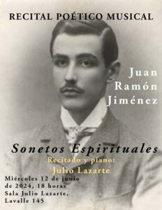- Miércoles 12 de junio: “Sonetos Espirituales”, de Juan Ramón Jiménez, a las 18, en la Sala Lazarte. Recitado y piano: Maestro Julio Lazarte.