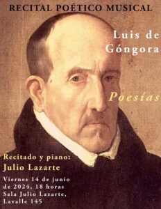 - Viernes 14 de junio: “Poesías”, de Luis de Góngora, a las 18, en Sala Lazarte. Recitado y piano: Maestro Julio Lazarte.