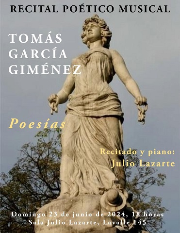 La presentación de “Poesías”, de Tomás García Giménez, tendrá lugar este domingo 23 de junio, desde las 18, en la Sala Lazarte, ubicada en Lavalle 145, con recitado y piano a cargo del Maestro Julio Lazarte.