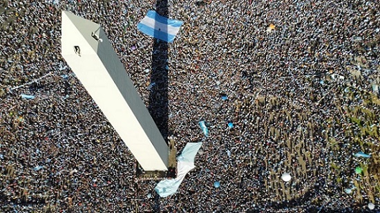 Una postal del Obelisco durante los festejos de la selección argentina (Photo by Emiliano LASALVIA / AFP)El primero en remarcar la necesidad de llevar la copa a la Argentina fue el capitán. “Una locura. Se hizo desear, mirá lo que es, es hermosa. Es impresionante. La ansiábamos muchísimo. Sabía que Dios me la iba a regalar, que era esta, que la íbamos a lograr. Ahora quiero celebrar. No veo la hora de estar en Argentina y la locura que será eso. Quería cerrar mi carrera con eso y no puedo pedir más nada. Son los últimos años. De esta manera es algo impresionante”, dijo Messi en diálogo con TyC Sports.