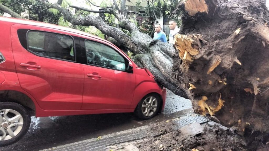 La escena se repite casi sistemáticamente con cada lluvia. Esta vez, la caída de un árbol de gran porte destrozó el capot de un automóvil y obligó a cortar la circulación vehicular sobre calle Lavalle, casi 9 de Julio, en barrio Sur.