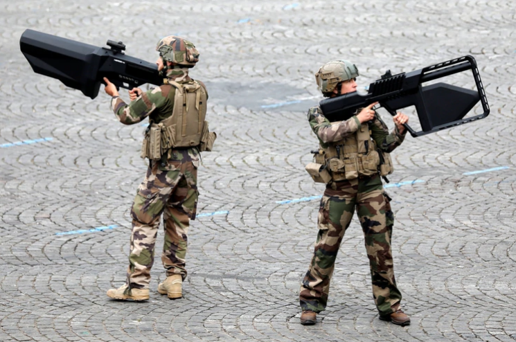 Los soldados franceses se mostraron con fusiles anti-drones DroneGun Tactical de la empresa australiana DroneShield, un arma con la capacidad de forzar el aterrizaje de vehículos no tripulados a un alcance máximo de dos kilómetros, al anular a su operador el control del aparato.