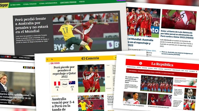 “Perú pierde por penales el repechaje a Qatar 2022″, indicó El Comercio. “Se acabó el sueño: Perú perdió por penales y no irá a Qatar”, indicó La República. “Perú no estará en el Mundial: Australia venció por penales en el repechaje y clasificó a Qatar 2022″, contó RPP. “Alex Valera no pudo marcar de penal y Perú pierde el repechaje al Mundial Qatar 2022″, sostuvo Correo.
