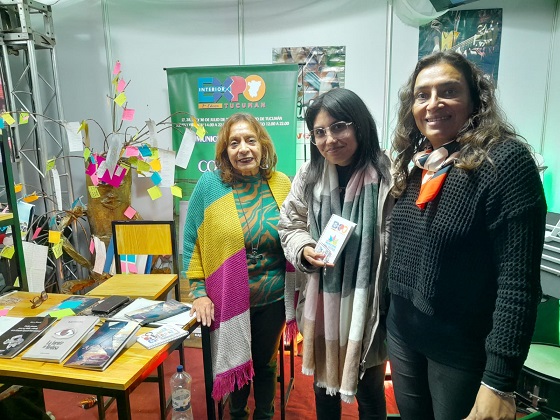 Melcy Ocampo junto a una joven escritora que se acercó al stand talitense y la poeta Romi Carrizo.