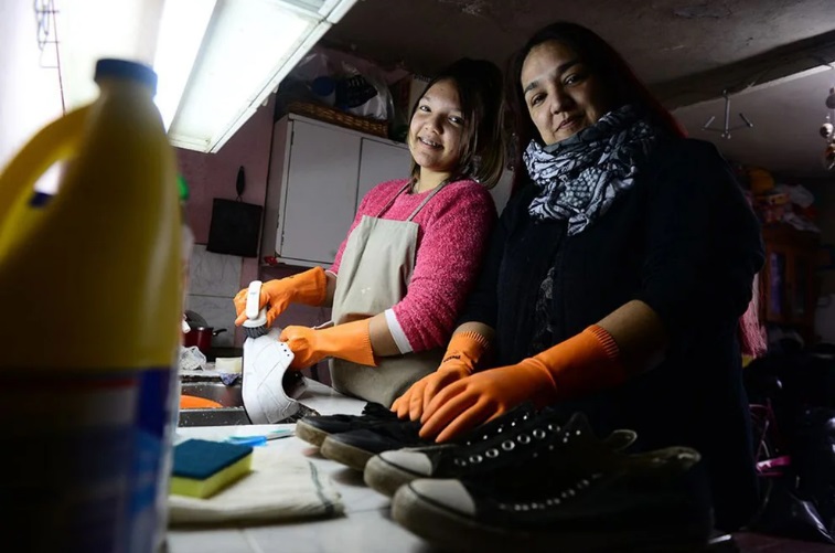Carla y Keyla son madre e hija, cuando por la pandemia cerró la pyme donde trabaja la mujer surgió la idea de ofrecer una tarea que a muchos les resulta tediosa. La iniciativa fue un éxito y llegan a lavar 30 pares por semana.