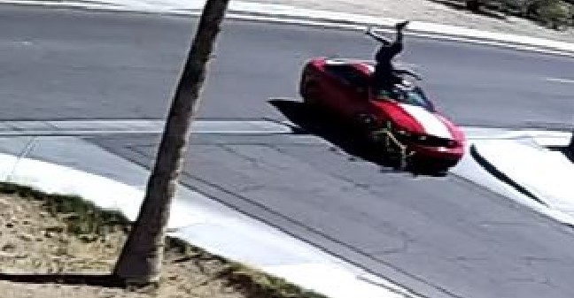 Cuando el hombre sale del parque en su bicicleta no se da cuenta que su novia, Misty Lee Wilke (44), estaba esperándolo en la esquina a bordo de su auto. Cuando lo tiene a pocos metros, Misty pisó el acelerador de su Mustang rojo y sin miramientos atropella al hombre que vuela por los aires. El suceso fue grabado por una cámara de vigilancia de un vecino.