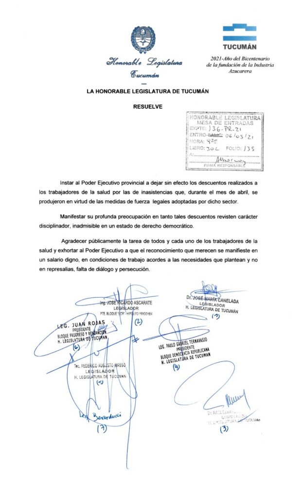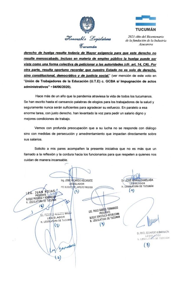 El documento lleva la firma de los Legisladores Ricardo Ascárate de la UCR, Juan Rojas de Progreso y Renovación, José María Canelada de la UCR, Paulo Gabriel Ternavasio de Democracia Republicana, Federico Masso de Libres del Sur y Raúl Albarracín de la UCR.