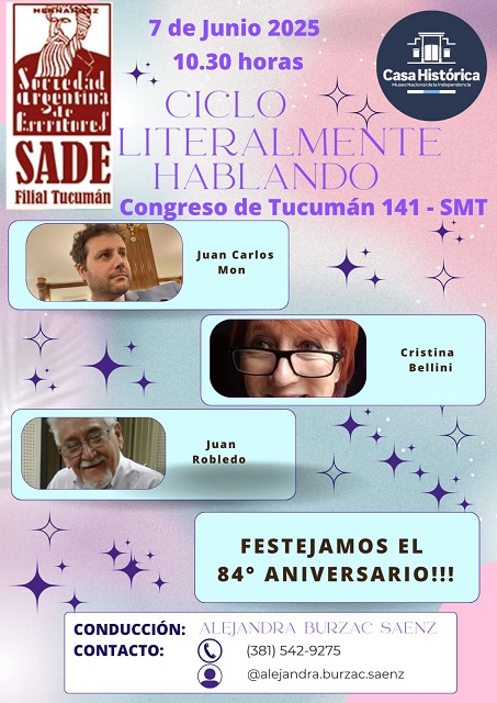 El ciclo “Literalmente hablando”, de la SADE Tucumán tendrá una cartelera de escritores importante, como todos los primeros sábados de cada mes. En esta oportunidad se convocó a Juan Carlos Mon, Cristina Bellini y Juan Robledo.