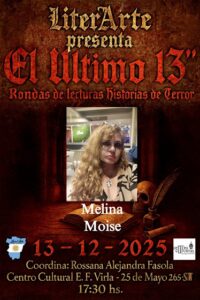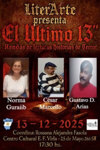 El espacio cultural LiterArte, creado y coordinado por Rossana Alejandra Fasola, presentará este sábado 13 de diciembre, a las 17.30, en el Centro Cultural Virla, de 25 de Mayo 265, “El Último 13” Rondas de lecturas Historias de Terror.