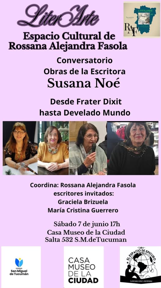 Letras de Fuego / Noticias. “LiterArte, Espacio Cultural de Rossana Alejandra Fasola”, propone para este sábado 7 de junio, desde las 17, en la Casa Museo de la Ciudad, un conversatorio con obras de Susana Noé. Escritores invitados.