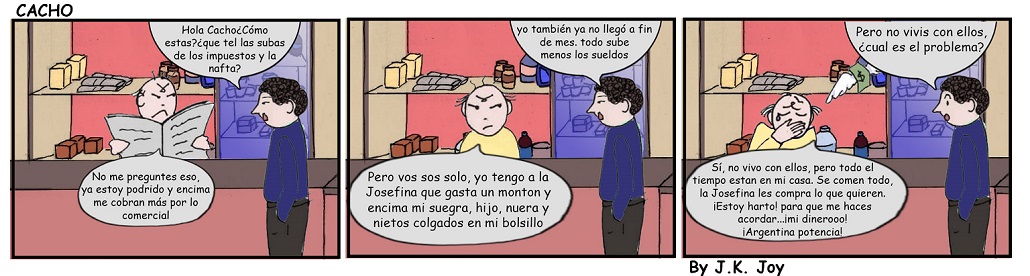 El personaje principal de la tira cómica de Diario Cuarto Poder , Cacho, Creado por J.K. Joy, no quiere escuchar los lamentos de su amigo ya que le hace pensar en los gastos de su casa