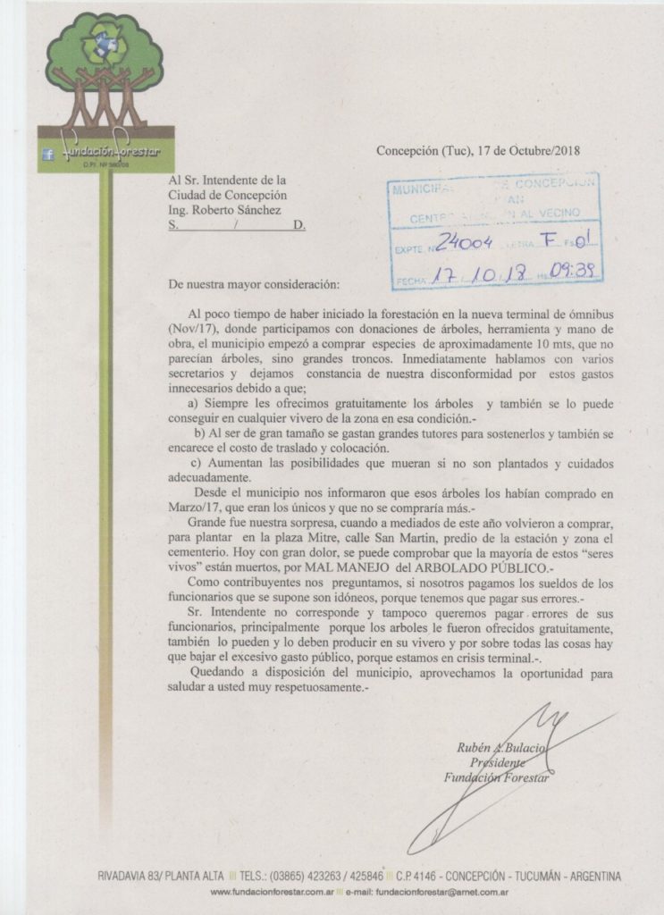 Bulacio relató que intentó tener contacto con el Director de Medio Ambiente, el Ingeniero Sebastián García, a cargo de esta área, y con el intendente, Roberto Sánchez, pero no tuvo éxito en hacerles entender que su accionar con los ejemplares no era el correcto y que podrían haber obtenido los árboles de manera gratuita. Situación más que llamativa y que merece una auditoria de gastos al menos.